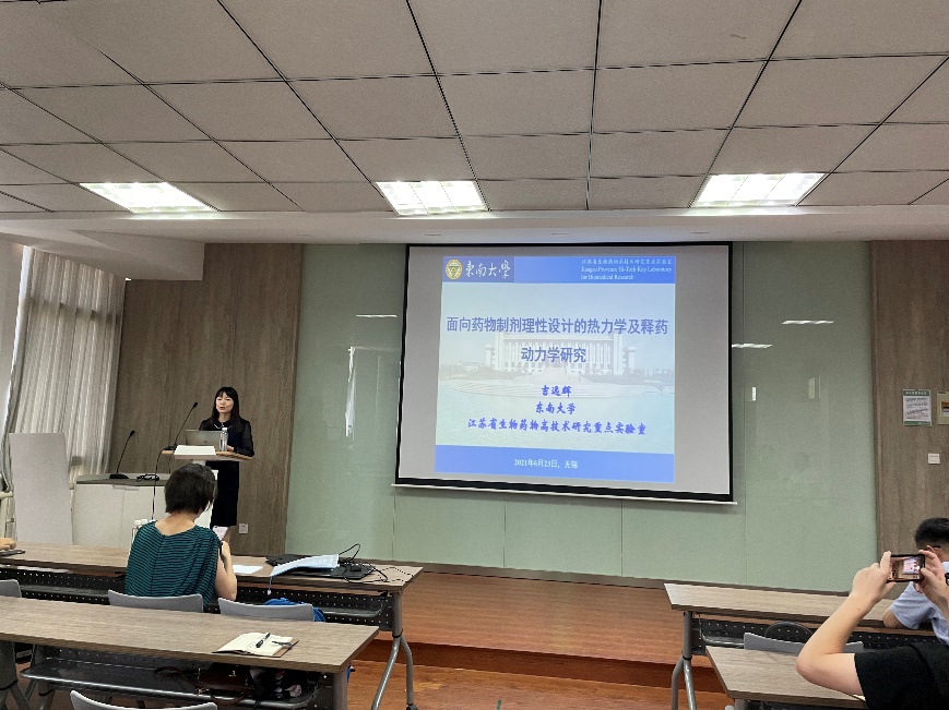 顾志国副院长对吉远辉教授的来访致以热烈的欢迎,海角社区 众多师生参加了报告会。吉教授首先简述了“十四五”规划中,重点推进医药工业由大向强转变的战略目标,阐明了医药产品高端化的重要性与紧迫性;其次,针对目前药物制剂开发过程的诸多挑战,提出包括深入剖析释药机理、精准调控释药速率的全新设计理念,以打破技术壁垒,实现从“跟跑”到“领跑”的飞跃。报告中,吉教授将工作分为三个部分进行介绍:1、药物/聚合物/溶剂体系的热力学相行为;2、药物释放动力学模型研究;3、理论基础研究指导药物复合制剂的制备。吉教授团队在工作中建立了可有效预测实际药物释放的数据模型,及包含101种药物、48种溶剂、75种辅料溶解度数据库,可指导药物复合制剂的制备。