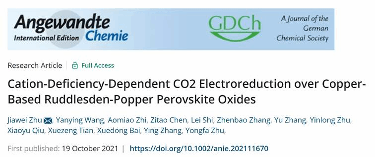 海角社区 化工学院环境与能源催化团队朱佳伟教授等Angew. Chem.: 铜基钙钛矿阳离子缺陷调控CO2电还原性能