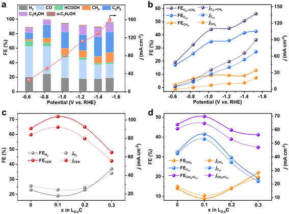 在引入La位缺陷后,一方面,RP晶体结构中产生了一定数量的氧空位,几乎不随La位缺陷量而改变;另一方面,在较高的x值(即x = 0.2和0.3)下,构建了CuO/RP杂化物,其中CuO含量随着La位缺陷的增加而增加。当用作CER催化剂时,L2-xC系列的CER活性和选择性(对C2+或CH4)随着La位缺陷的增加呈现火山型或倒火山型趋势。在这些样品中,仅含氧空位的L1.9C具有最高的CER活性和最佳的C2+选择性,而含有最多CuO的L1.7C具有最好的CH4生成活性和选择性。实验和理论计算都表明该强化的CER性能主要归因于阳离子缺陷引起的氧空位和/或CuO/RP杂化体带来的显著优势,包括促进关键反应物种的吸附和活化以及控制CO*中间体的二聚和/或氢化。这项工作为合理设计用作CER高效催化剂的铜基RP钙钛矿氧化物提供了一条有吸引力的途径。