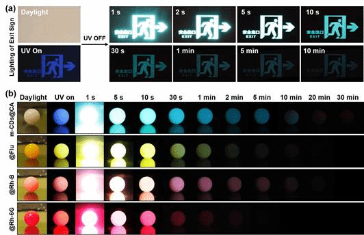 碳点基有机长余辉复合体的(a)应急显示和(b)多色夜明珠应用演示图