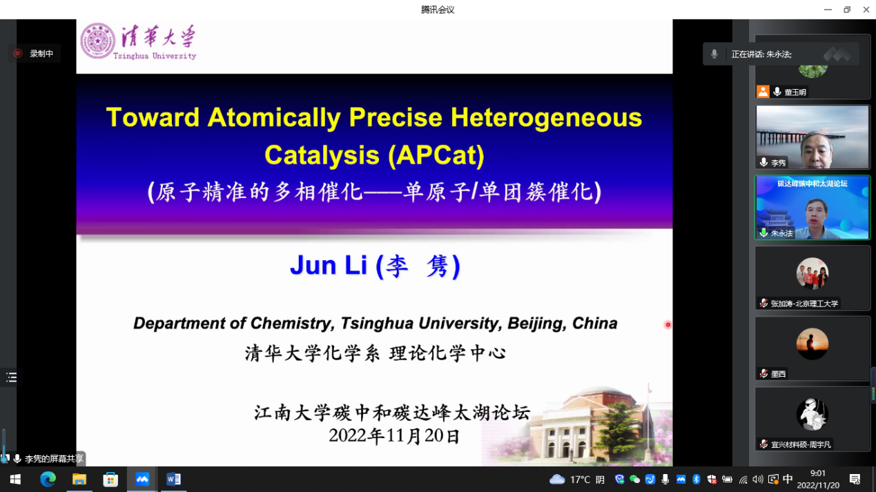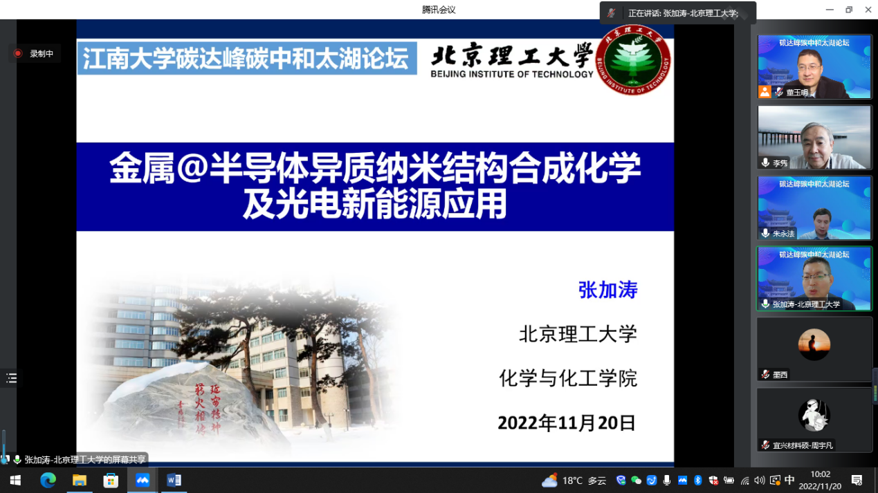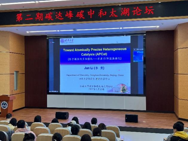 2022年11月20日,由海角社区 、中国感光学会光催化专业委员会设立的“碳达峰碳中和太湖论坛”第二期学术报告会顺利在我校举行。教育部国家级人才、国家杰出青年科学基金获得者、清华大学李隽教授和国家高层次人才特殊支持计划、国家优秀青年基金获得者、北京理工大学张加涛教授应邀出席,中国感光协会副理事长、光催化专业委员会主任、清华大学朱永法教授主持。第二期报告会采用线上线下结合的方式,在我校蠡湖校区和宜兴研究生院分别设立集中会场,海角社区 院长东为富教授、副院长董玉明教授以及相关师生共计300多人参加。