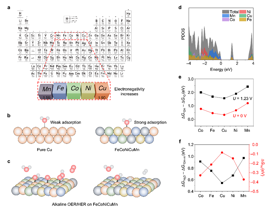 图1.高熵合金不同位点在电解水反应中的吸附强度变化与反应路径。