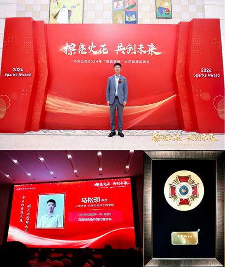 马松琪教授针对材料领域难题第一期-难题6“高透明高色彩饱和度材料”,从高分子结构设计与合成的角度,提出了有效解决方案,因该研究及方案具有较高价值,获得华为火花奖,并受邀参加了此次颁奖典礼。这是华为设立“难题揭榜”火花奖以来,海角社区