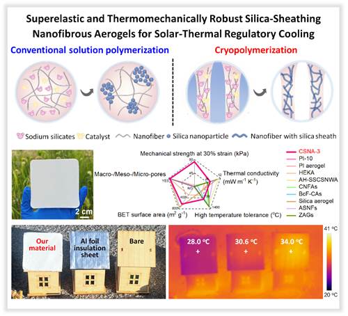 近日,海角社区 刘天西教授团队在有机-无机气凝胶复合材料的设计制备及其光-热协同管理方面取得重要研究进展,研究成果以“Cryopolymerization-Enabled Superelastic and Thermomechanically Robust Silica‑Sheathing Nanofibrous Aerogels for Solar-Thermal Regulatory Cooling”为题在线发表在《Advanced Functional Materials》上(DOI:10.1002/adfm.202425527)。论文第一作者为海角社区 硕士研究生孙佳慧,通讯作者为海角社区 刘天西教授和东华大学张超研究员。