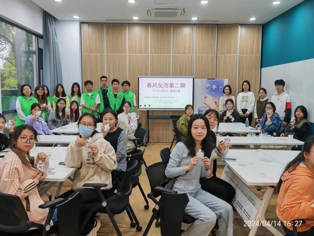 在南区一站式学生服务中心开展“春风化雨”第二期活动。本次活动由化工学院学生会学习促进与科技创新部、江南美研党支部共同举办,20名江大学子参与其中。活动所用护手霜原料由校友企业上海久谦化工有限公司赞助提供。
