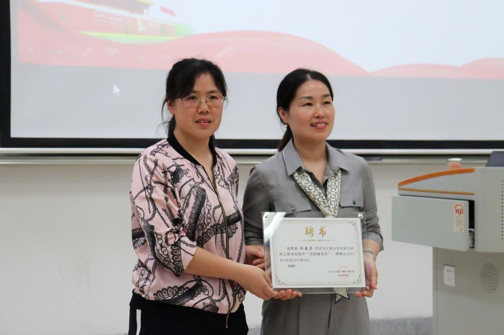 校外“法制辅导员”,为学生开展专业法律咨询和法律知识普及讲座。活动首先进行校外“法制辅导员”聘任仪式,田卫平代表学院为邵春香律师颁发聘书。