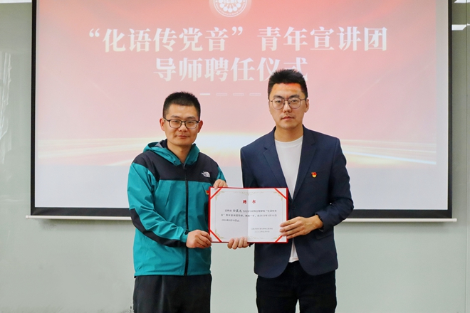 活动现场,党建工作辅导员杨璇还为“化语传党音”青年宣讲团成员代表颁发了聘任证书。