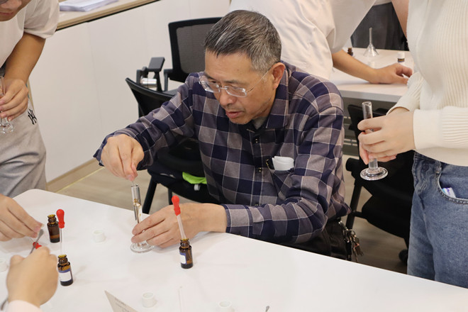 心手互动,调制独家香水。在调香师的讲解和指导下,同学们掌握了调制香水的方式方法。在选择香精和调制香水的过程中,同学们积极交流互动,在实操环节互帮互助,最终每位同学都得到了一瓶代表个人江南记忆的香水。在由调香专业老师和研究生组成的“品香团”品鉴评比后,表现优异的同学被评为“优秀小调香师”。