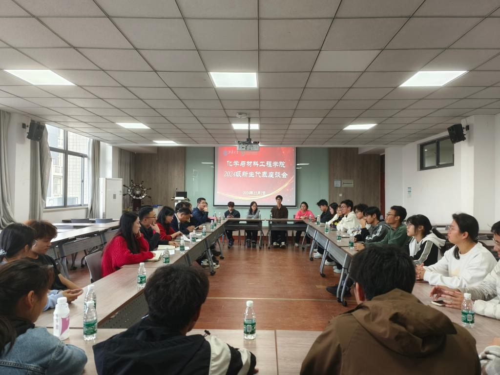 于11月7日在化工楼A316会议室举行新生代表座谈会。学院党委书记潘庆伟、学院党委副书记兼副院长董霞、学院分团委书记鞠峰、2024级本科生辅导员马之禾以及30余位新生代表参加本次会议。