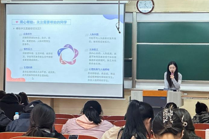 于11月21日在蠡湖校区一教1B103教室举办“健康守门员”赋能计划第四期培训。本次培训由学院心理辅导员郝林青主讲,学院全体本科生心理委员、2024级本科生宿舍长以及全体研究生网格员参与培训,东氿校区同步线上观看。