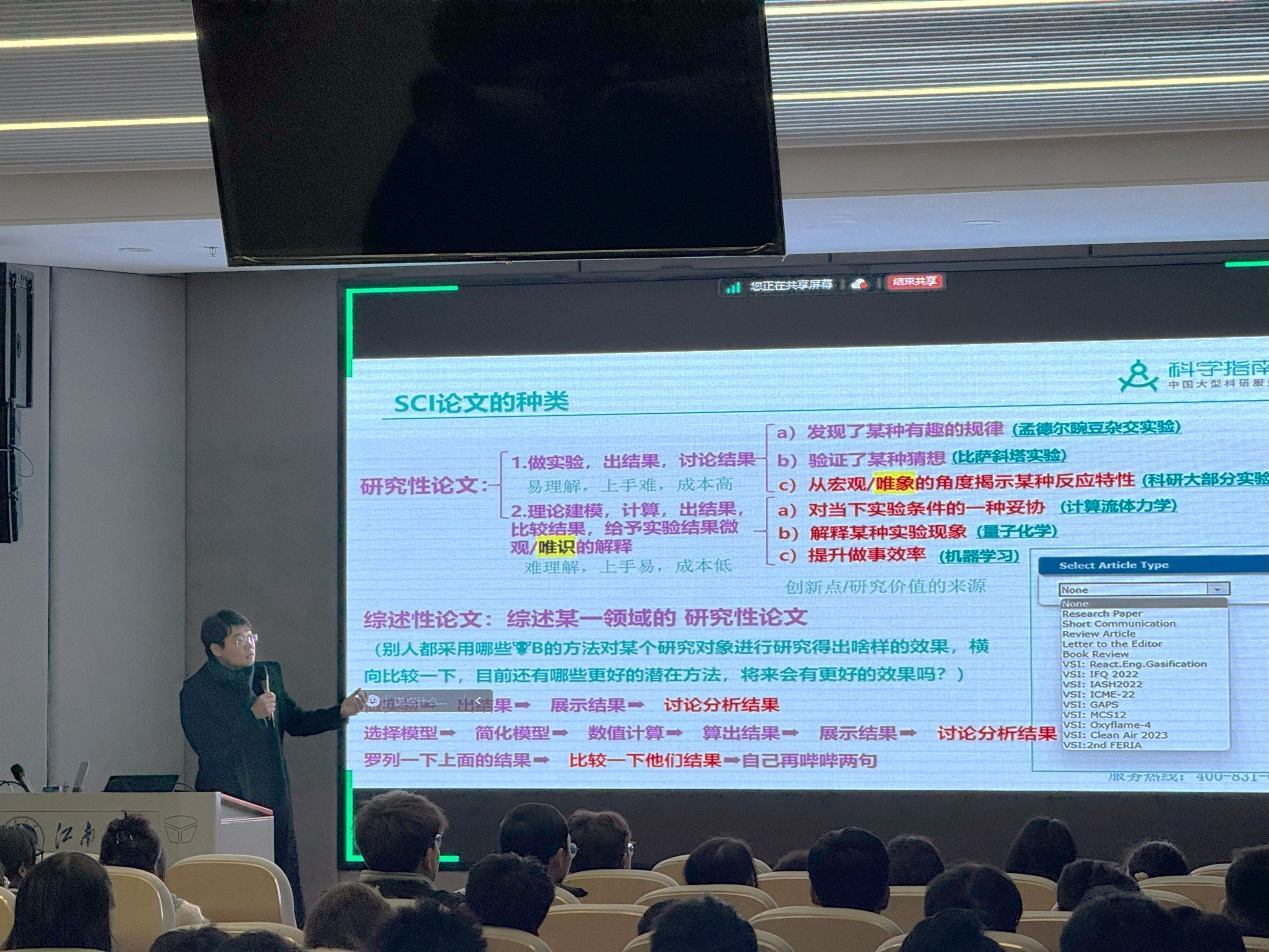 陈斌,热能工程博士,主要研究方向为能源化工,智慧能源大数据分析,碳基能源热化学转化过程的微尺度研究。讲座中,他分别就文献阅读与论文写作进行了详细的分析与讲解,通过一个个经典的实例介绍了文献综述组成、阅读文献的步骤、文献综述撰写方法、选题方向、选题注意事项准备工作等内容,生动形象地向同学们分享了论文阅读与写作的技巧和方法。他强调,要写好SCI论文,要有良好的撰写习惯与方法论。论文撰写过程中每一部分都要简洁明了且有逻辑性,要发现新视角,运用新方法,让一篇论文脱颖而出,特别是在论文标题和摘要部分,要能抓住读者眼球,引起读者阅读兴趣,清晰明了地概括文章核心内容。
