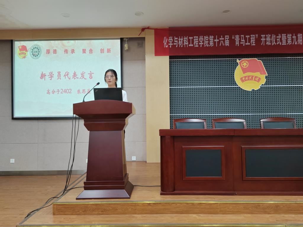 紧接着,董霞为第十六届“青马工程”培训班授旗,新学员代表高分子2402班朱思盈同学上台发言,承诺将在本次培训班中努力学习,提升自我,继续学习好、传承好、发扬好党的红色精神,努力成为一名坚定的青年马克思主义者。