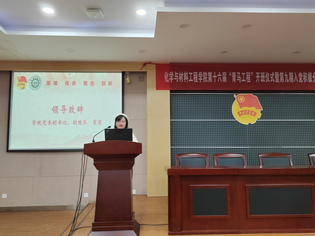 第十六届“青马工程”开班仪式暨第九期入党积极分子培训在化工楼B329会议室举办。学院党委副书记、副院长董霞,学院关工委委员、校特邀报告员、特邀党建组织员蒋平平、学工办主任兼分团委书记鞠峰,2021级本科生辅导员、党建辅导员郝林青,2024级本科生辅导员马之禾,第十五、十六届“青马工程”学员以及第九期入党积极分子150余人参加本次活动,活动由分团委学生副书记刘亦菲主持。