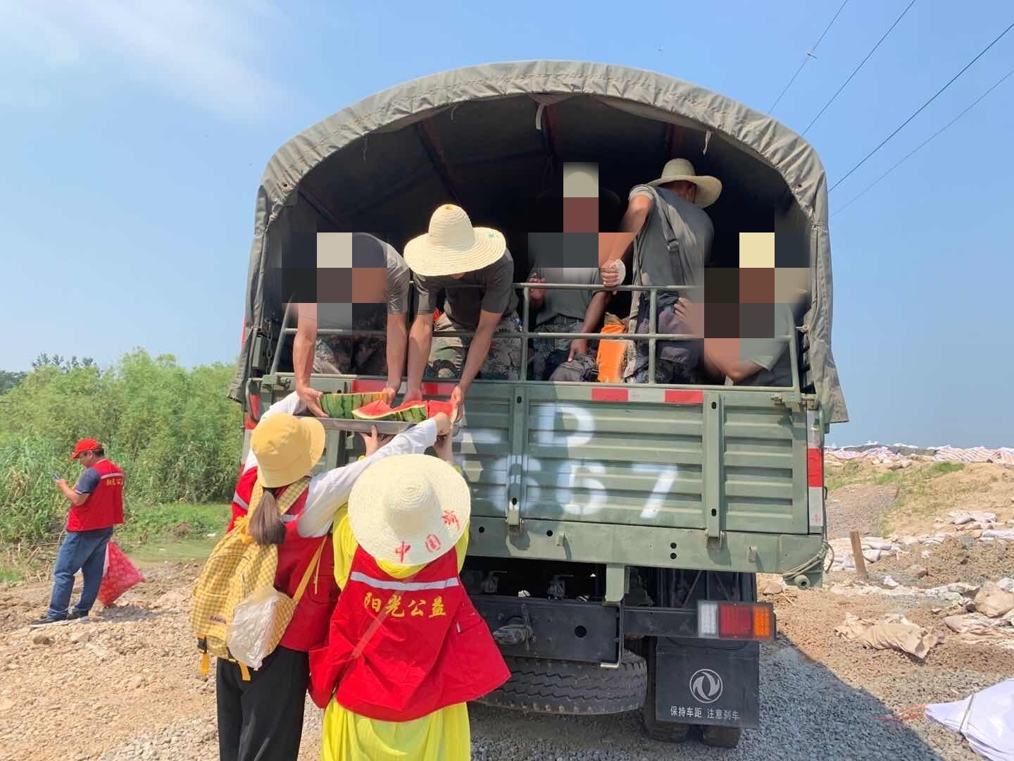 方文静同学与11位庐江县阳光公益协会的志愿者自发前往安徽洪涝灾害地区,为抗洪抢险官兵送去清凉饮品与水果。