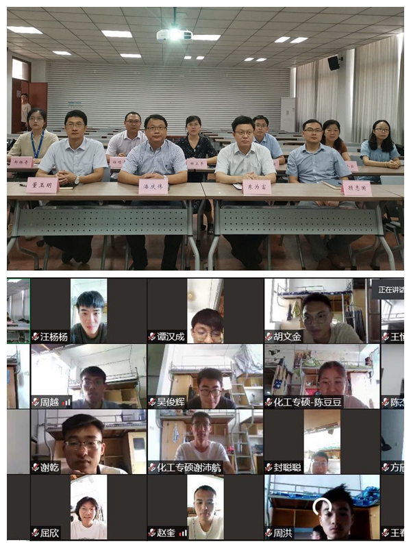 9月4日下午,化工学院研究生新生入学见面会以线上视频会议形式召开。化工学院党委书记潘庆伟,院长东为富,党委副书记、副院长田卫平,副院长董玉明,副院长顾志国,副院长马丕明,研究生秘书阮小云,分团委书记任增亮以及研究生辅导员郝林青出席本次会议。