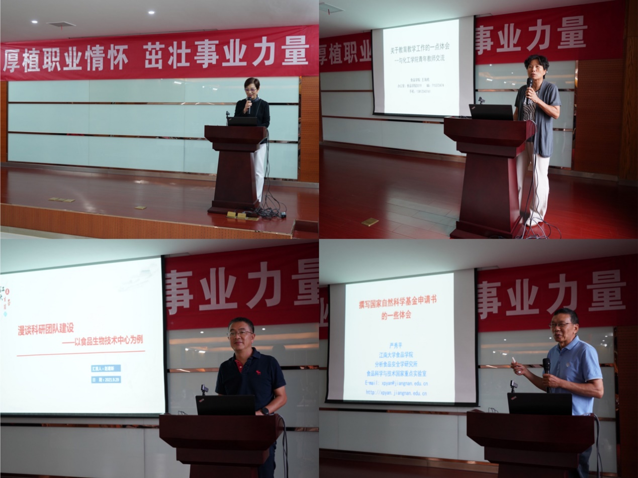 本次交流活动围绕青年教师教书育人、科学研究及在团队中成长等方面展开。食品学院王海鸥老师做了教育教学经验的分享。她向大家阐释了“为什么做老师”、“如何做好老师”两大问题。她强调了“启发式教学”的重要性,采用若干真实教学案例,生动还原了教学场景,深刻剖析了教学思路。她同时分析了学校、学院和青年教师在教育教学方面的现状及问题,提出了一系列解决办法。最后,她以“人皆可以为尧舜”结束分享,勉励在座青年教师坚守教书育人初心,成为德高望重的好老师。食品学院教授、杰出青年基金获得者严秀平老师做了关于撰写国家自然科学基金申请书的报告。他讲解了如何从评审专家的审视角度撰写申请书,从选题、研究目标、研究内容、拟解决问题、研究方案和技术路线、预期研究结果、可行性和创新性展示、工作基础、前期准备、参考文献等方面入手,详细解读了国家自然科学基金项目申请过程的各个环节与细节。招就处处长、食品学院生物技术中心赵建新老师做了有关团队建设的经验分享。他首先阐明了“为什么建团队”,然后从团队组建、团队成员、团队管理几方面分别做了深入讲解。他强调,团队要“有所为有所不为”,发展是硬道理;团队成员要志同道合,和而不同;团队管理中要做好计划,关键是落实。团队中要塑造家文化,团队成员之间要主动补位,建立良好的沟通渠道。三位老师的分享让大家获益匪浅。
