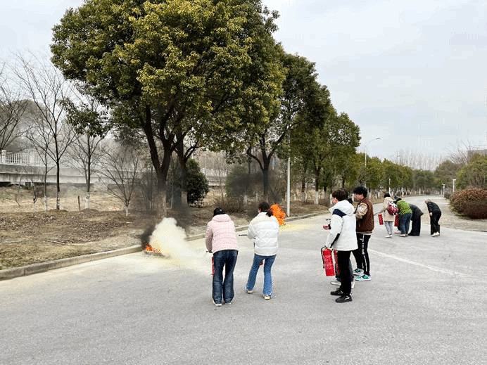 师生讲解了不同灭火器的区别和干粉灭火器的具体使用方法。随后,大家3人一组依次进行灭火演练。