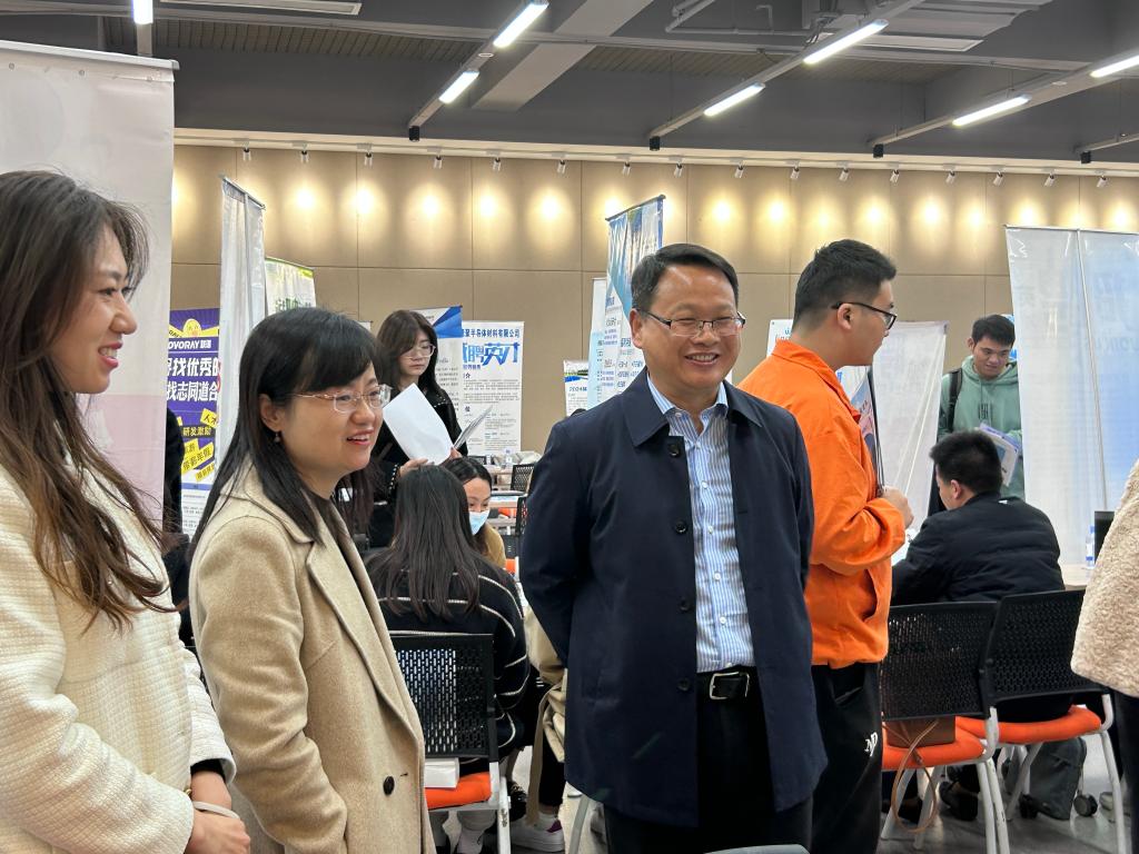 党委书记潘庆伟、学院党委副书记、副院长董霞到招聘会现场亲自指导,与用人单位沟通交流,详细了解企业的用人需求,与用人单位、求职学生展开互动,鼓励毕业生要树立正确的求职观,找准职业定位,提升求职技能,实现自己的职业理想。