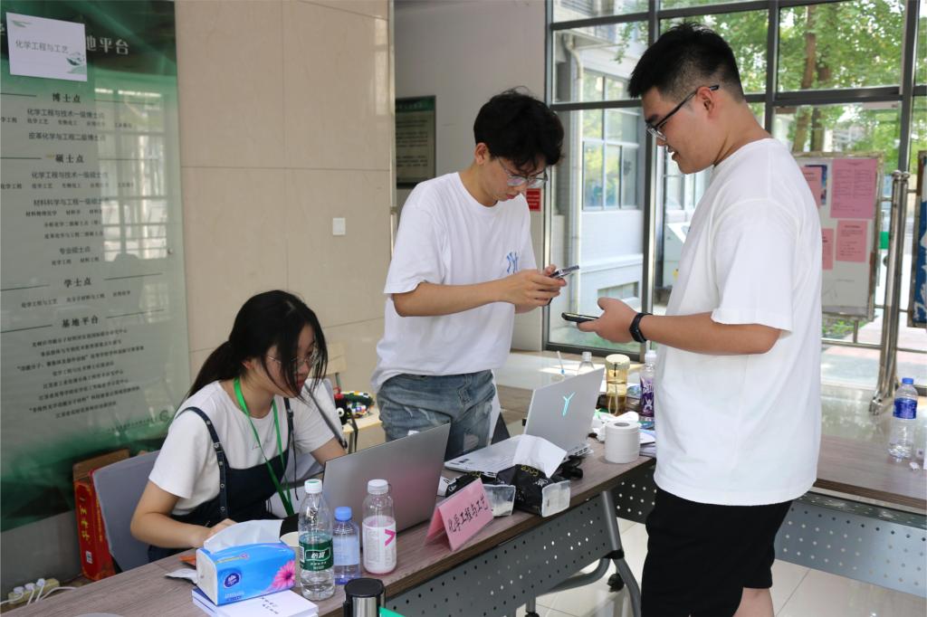 学生志愿者在化工楼、宿舍园区、重要路口分别为新生提供路线引导、咨询解答。报到现场设置了新生报到区、家长休息区和拍照打卡区,副班主任、迎新志愿者帮助新生完成资质审查、礼包发放、绿色通道流程。
