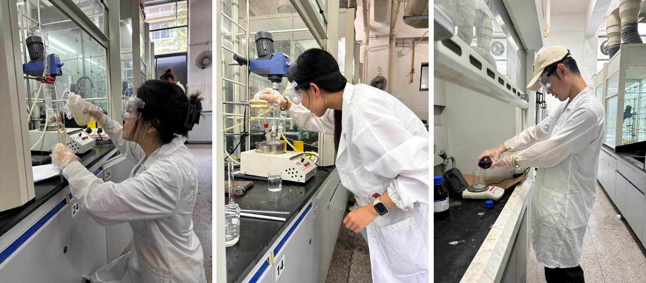 高分子材料与工程专业同学积极响应,共有包括杨思远、王梓璇、王歆宇、杨金子豪在内的16位同学报名参赛,最终现场参赛选手为13名。比赛以《甲基丙烯酸甲酯的悬浮聚合》实验作为竞赛项目,要求选手在4小时内完成实验装置搭建、聚合反应、产物处理以及仪器清理、归位等工序,最终制备出可供评分的聚合物。比赛现场由罗静、朱叶和魏玮三位老师作为评委。