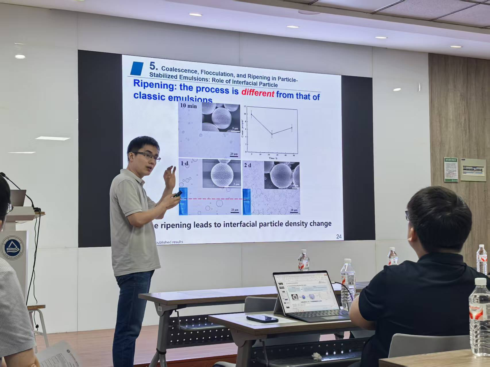 研讨会上,马丕明副院长首先对三位教授的来访表示热烈欢迎,并简要回顾了布里斯托大学与化工学院之间学术合作与交流的历史。研讨会分别由马丕明副院长和Wuge Briscoe教授主持。Wuge Briscoe教授做了题为“Centipede” Statistical Polymer under Nano-confinement: Surface Forces, Superlubricity, and Transient Interfacial Gels的报告,吴新虎研究员、王刚副研究员、孙冠卿教授、杨伟军副教授、蒋航副教授、祝宇微副教授、宋冰蕾副教授分别针对各自领域做了学术报告,内容涉及离子液体组装与润滑性能、脂多糖的超分子组装、界面颗粒的行为及稳定机制、聚氨酯弹性体、微凝胶软颗粒作为乳液界面开关的行为、用于引导组织再生的生物界面涂层以及表面活性剂形成的热增稠流体等方面。报告内容丰富,与会人员展开了热烈讨论与互动。会后,Wuge Briscoe教授对本次研讨会进行了高度评价。