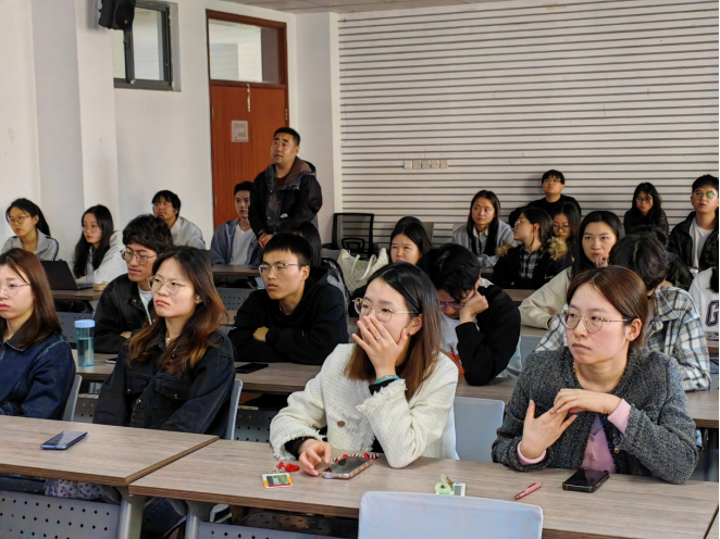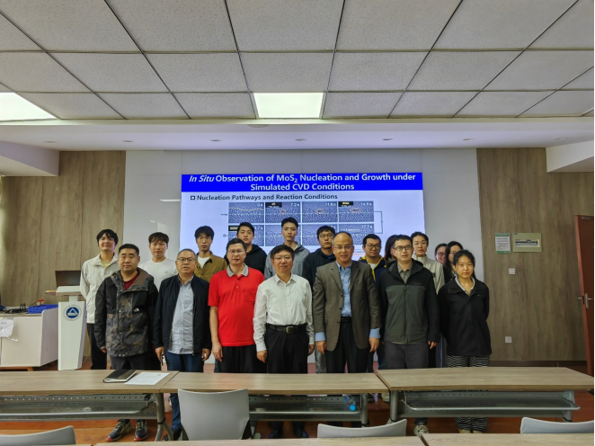 报告伊始,王教授以费曼名言“There’s plenty of room at the bottom”破题,抛出中国科协列出的两大科学难题——“原子尺度精准制备”与“微观动力学实时成像”:既然底部空间无限,为何仍无法制造出“原子级完美”的材料?答案直指“看不见、控不住”。他指出,原子级制造必须回答两个核心问题:原子如何“生长”?长在“何处”才能为我所用?随后,王教授播放“原子电影”,展示如何利用环境透射电镜(ETEM)锁定Pd/MoS₂“最佳站位”,以及Au纳米颗粒在ReS₂表面的迁移与聚合,并总结:“谁掌控了界面,谁就掌控了生长路径。”报告后半段,他结合化学气相沉积(CVD)、原子层沉积(ALD)、聚焦离子束(FIB)、第一性原理计算与机器学习等交叉成果,阐明多学科融合对制备“原子级完美”催化剂的不可替代价值。交流环节,师生围绕ETEM原位观测的Pd/MoS₂颗粒生长驱动力、电镜原子级制造催化剂的瓶颈等踊跃提问,王教授逐一深入解答。