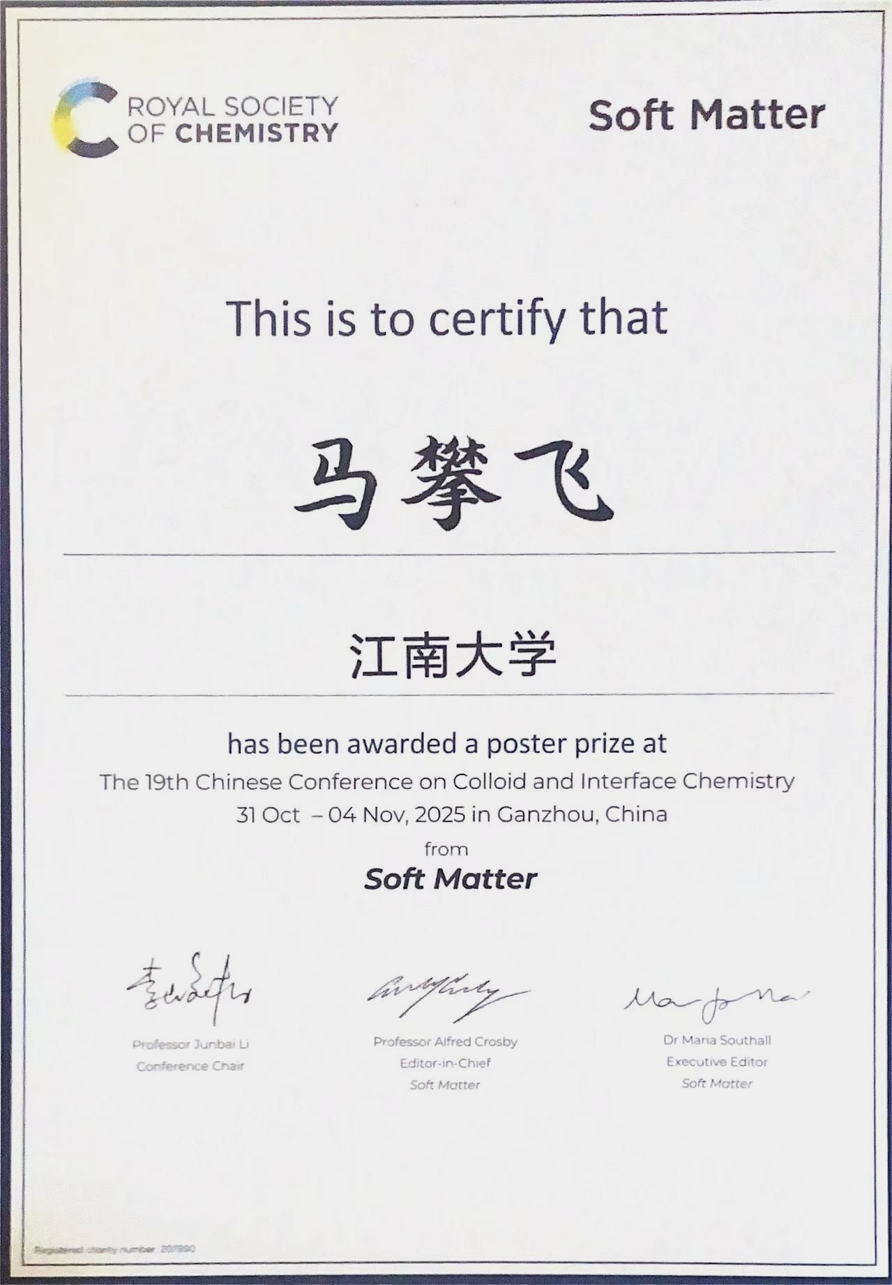 将持续深耕胶体与界面化学领域,进一步加强与国内外顶尖科研团队的合作交流,推动更多高质量研究成果落地转化,为我国胶体与界面化学学科发展及相关产业升级贡献更多“江南力量”!