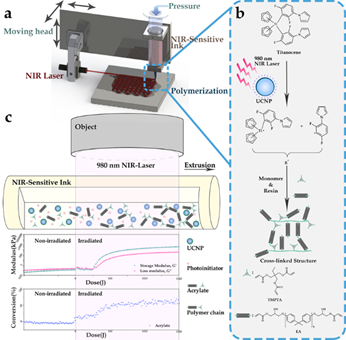 刘仁教授团队长期致力于光聚合基础及其在涂料、微电子和3D打印领域的应用技术研究;机械工程学院刘禹教授团队主要开展3D打印工艺与机电装备技术研究。双方团队联合攻关,基于近红外激发上转换粒子原位发射紫外-可见光的策略,设计了全新的3D打印材料,并在自主设计的工艺装备上,率先建立近红外辅助3D墨水直写技术,实现了多色彩材料、跨尺度(3个量级制造分辨率)、无支撑的3D打印,打破了传统三维成形方法的材料局限性与制造精度局限性,有望加速3D打印技术在柔性传感、软体机器人与生物医疗领域的应用。