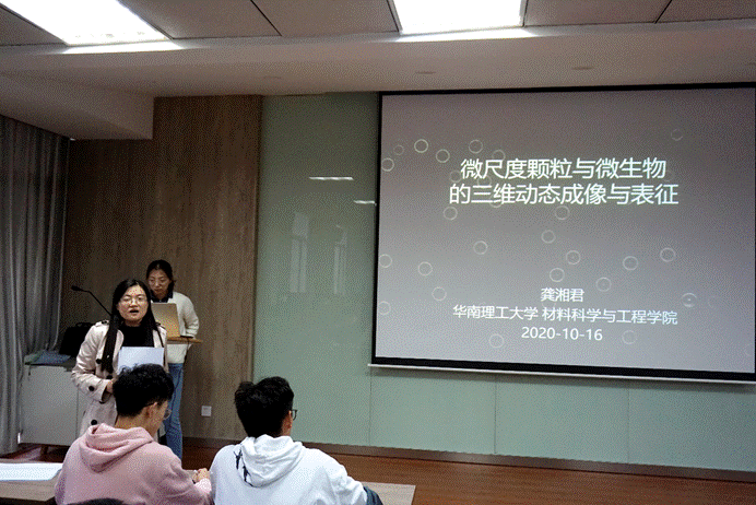 2020年10月16日,华南理工大学材料科学与工程学院龚湘君教授来海角社区 访问,并于下午3:30在海角社区 A316学术报告厅作了主题为“微尺度颗粒与微生物的三维动态成像与表征”的学术报告,化工学院罗静教授主持了该场报告。龚湘君教授从材料表征的基本需求出发,分析了微尺度三维成像技术,使我们深入了解诸如颗粒粘附、脱附、微生物附着生长等诸多重要的物理现象。龚湘君教授展示了一种基于光学干涉的三维显微成像技术-数字全息显微镜(Digital Holographic Microscopy (DHM)),并发展了高通量、高精度的三维追踪算法。他们的研究揭示了细菌对界面物理化学性质的主动响应是细菌近界面行为的重要组成部分,为我们设计新一代抗菌、防污和防腐材料提供了新思路。该场学术报告不仅吸引了化工学院众多师生,同时还吸引了许多食品学院、纺服学院和环土等学院的同学与老师聆听报告,现场气氛十分活跃。报告结束后,龚湘君教授就参会老师和学生的相关问题进行了详细的解答。