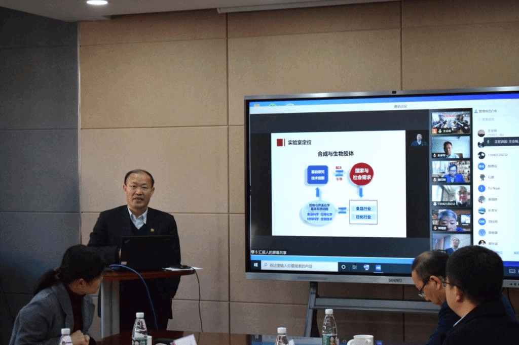 副校长、实验室主任顾正彪教授首先做2021年度工作报告,介绍了实验室概况、年度亮点工作及各项工作所取得的进展等。随后,蒋建中教授、钟芳教授和杨成教授代表实验室三个研究方向分别做了题为“智能型表面活性剂的分子设计、合成与应用”、“脂溶性营养素的递送及其生物利用率研究”和“新型化妆品运载体系的构建”三个学术报告。与会专家认真听取了报告,并对重点实验室在基础研究、人才培养、队伍建设、成果转化、学术交流与合作等方面的工作进行了细致深入的讨论。