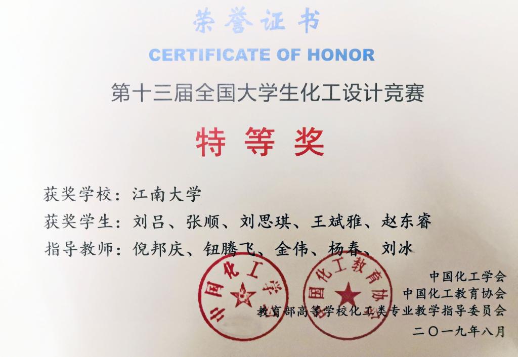 近三年来,学生获得全国大学生化工设计竞赛特等奖3项、二等奖4项,第四届中国“互联网+”大赛金奖1项,“创青春”创业竞赛金奖1项,全国“挑战杯”大赛二等奖1项、三等奖1项,中国大学生高分子材料创新创业(PMC)大赛全国一等奖2项。获得全国大学生数学竞赛、大学生服务外包创新创业大赛、江苏省化学化工实验竞赛、江苏省高等数学竞赛等省部级以上竞赛奖励50余项。