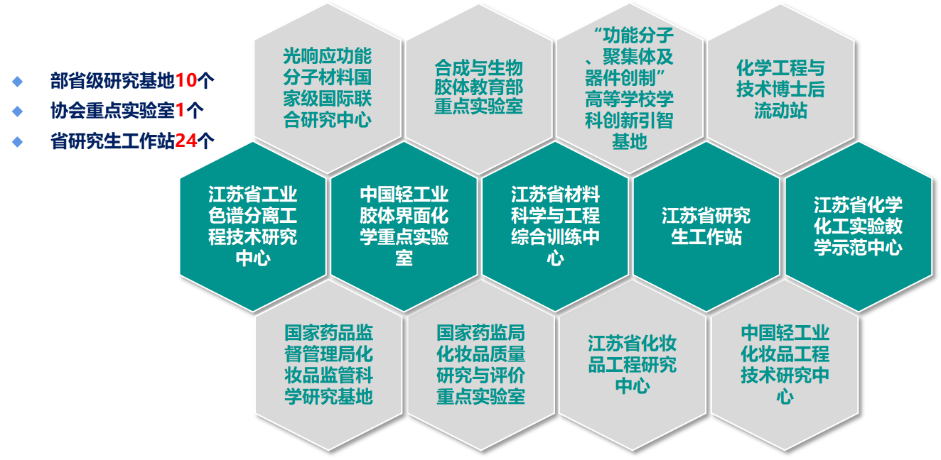 学院拥有“非线性光学功能分子材料”科技部重点领域创新团队、教育部“创新团队发展计划”滚动支持团队和江苏省高校优秀科技创新团队。新组建表面活性剂与化妆品、纳米复合与能源材料、绿色涂料科学与技术、功能高分子及复合材料、催化与绿色反应、智能材料与催化、分子合成与生物活性等七个研究中心。学院每年承担数十项国家自然科学基金、国家重点研发计划和部省级科技攻关项目等,及上百项企业开发项目。年科研经费数千万元,发表三大检索论文200多篇,申请、授权专利500余项。近年来,获得省、部级以上科技成果奖20余项。每年举办多场国际国内研讨会。